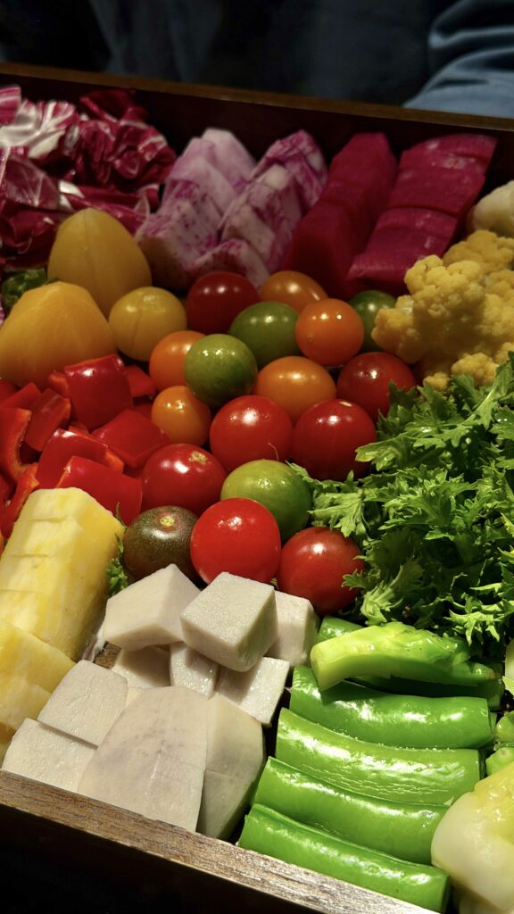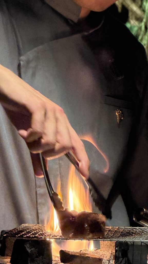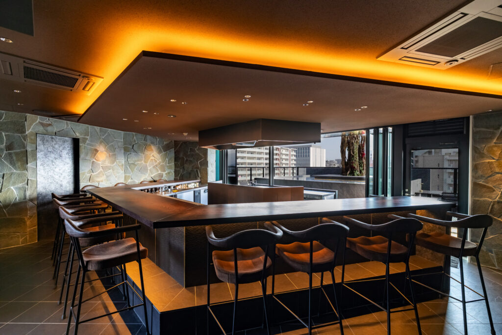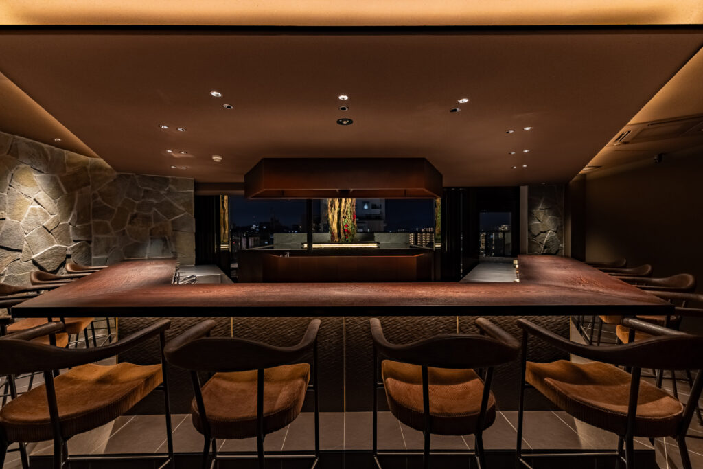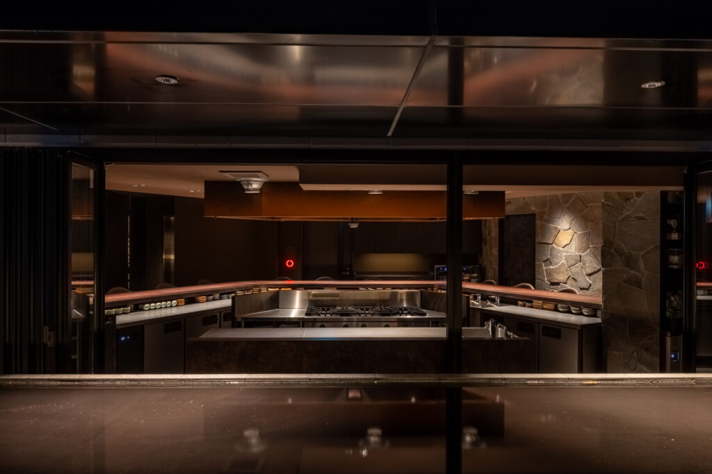 料理人の鮮やかな所作、炭火が弾ける音、そして立ち上る香り。そのすべてをゲストが至近距離で共有できるこの「シェフズテーブル」は、食の劇場体験。あえて多角形に構成することで、どの席からも調理の中央に目線が向き、厨房の熱気がダイレクトに伝わり、場に心地よい緊張感と高揚感を生み出しています。