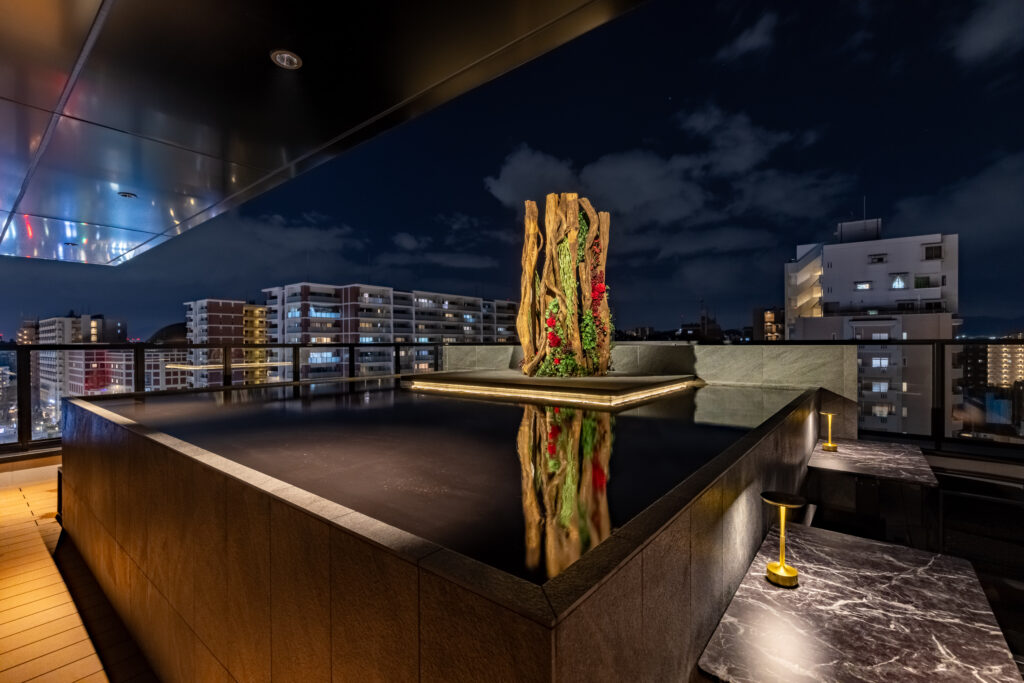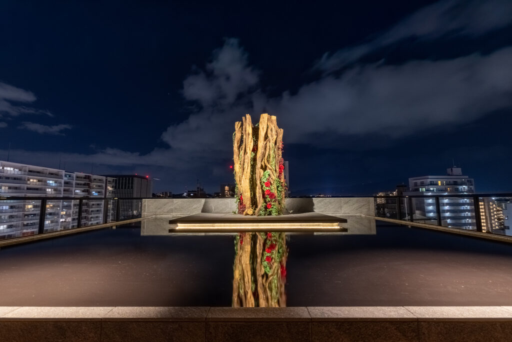 六本松の夜景を背景に、ライトアップされた巨大なシンボルオブジェが暗黒の水面に深く映り込みます。店内から窓越しにこの景色を望むことで空間に無限の奥行きが生まれ、訪れたゲストに圧倒的な非日常感と、都会のオアシスのような静けさを提供します。