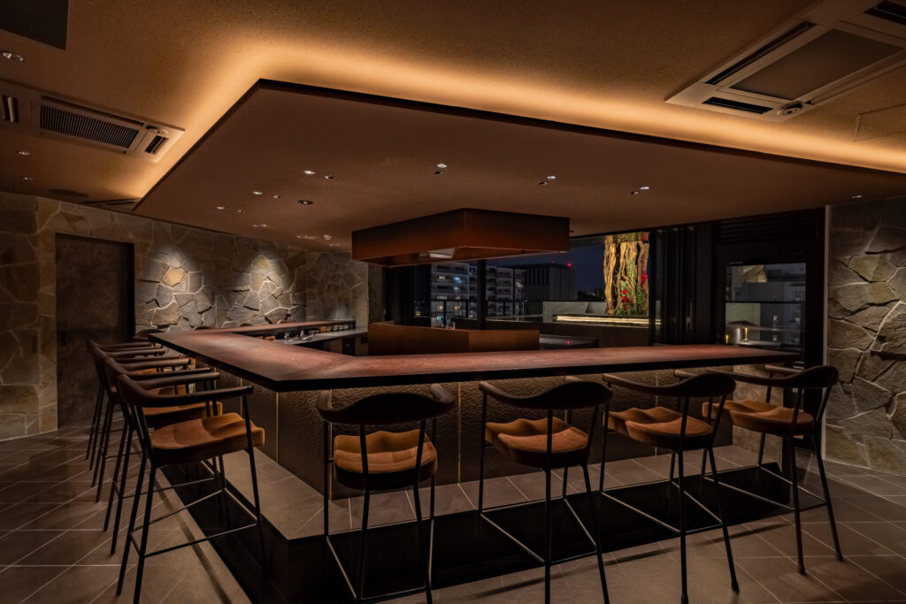 料理人の鮮やかな所作、炭火が弾ける音、そして立ち上る香り。そのすべてをゲストが至近距離で共有できるこの「シェフズテーブル」は、食の劇場体験。あえて多角形に構成することで、どの席からも調理の中央に目線が向き、厨房の熱気がダイレクトに伝わり、場に心地よい緊張感と高揚感を生み出しています。