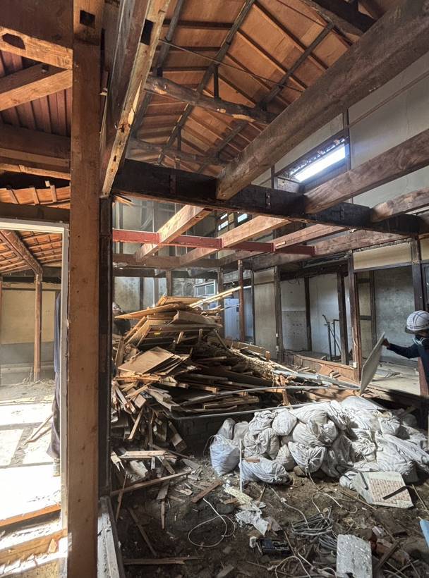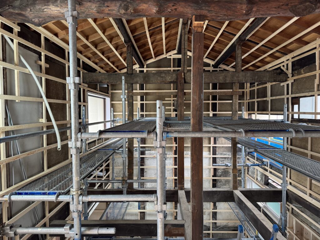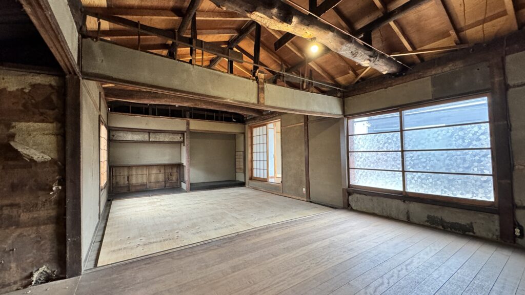 躯体の力を引き出す、骨格デザインとして、町家の時を重ねた柱や梁をあえて露出させ、二層の吹き抜けによるダイナミックな空間として構成。光と陰影が、構造体の造形美を際立たせます。